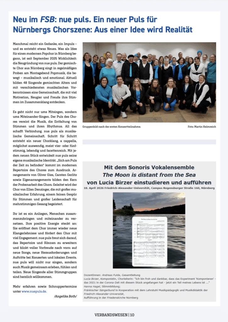 Wir freuen uns riesig: Unser Chor nue puls wird in der aktuellen Ausgabe der in|takt, der Verbandszeitschrift des Fränkischen Sängerbundes, vorgestellt!